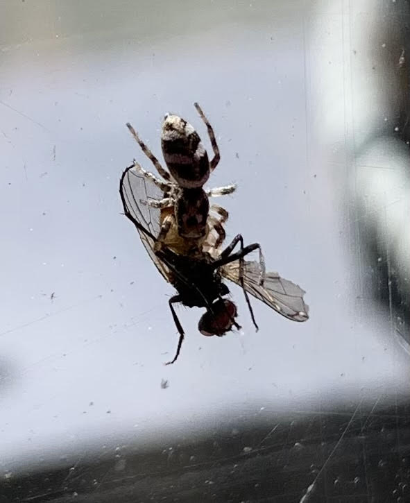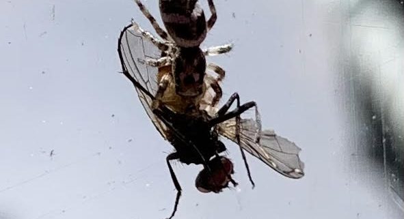 De bromvlieg is zich altijd bewust van gevaren. Allereerst spinnenwebben: ‘In een web komen is heel dom. Je moet goed kijken. Als je vastzit is het gebeurd. Dan zit je gevangen. Het is wachten op de spin. Je weet dat je verloren hebt.’ En buiten kan ze gepakt worden door een vogel: ‘We zijn aan elkaar gewaagd. Het is een mooi spel.’ “En als je gepakt wordt?” ‘C’est ça.’